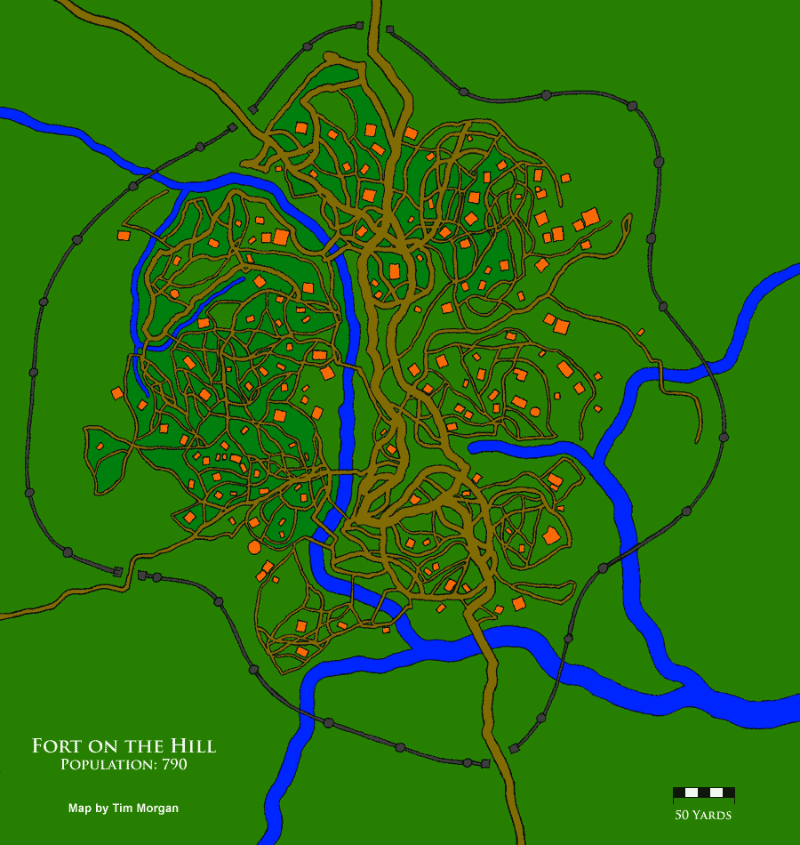 This is a map of the village of Fort-on-the-Hill in the nation of Kitar.