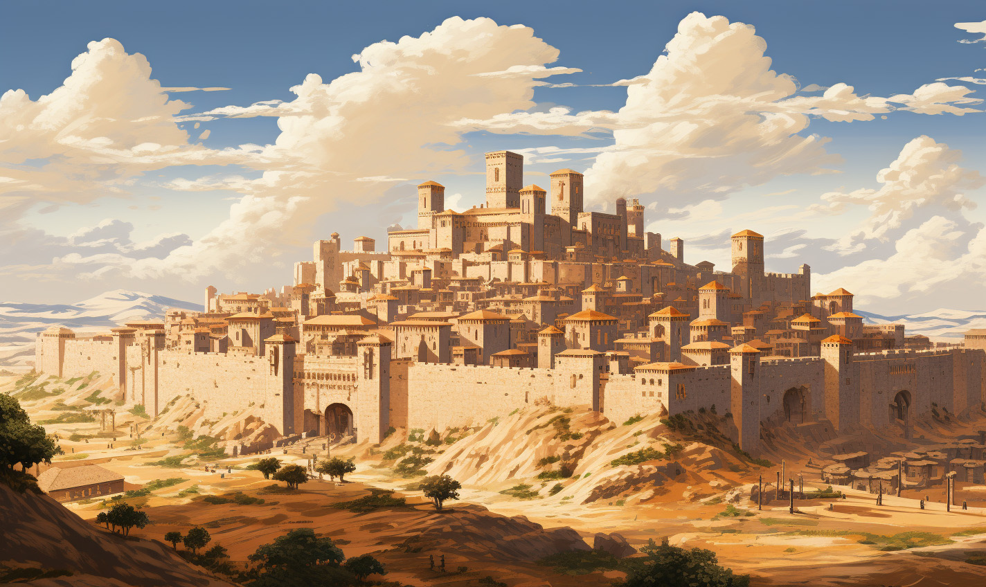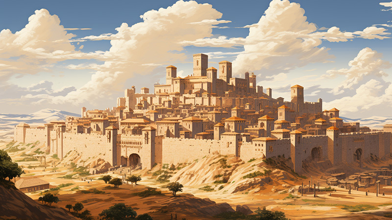 Due to its location at the edge of the empire, its history of resistance to imperial encroachment and its proximity to dangerous mountains and forests, this city is very well fortified with crenellated walls, high guard towers and strong gates.