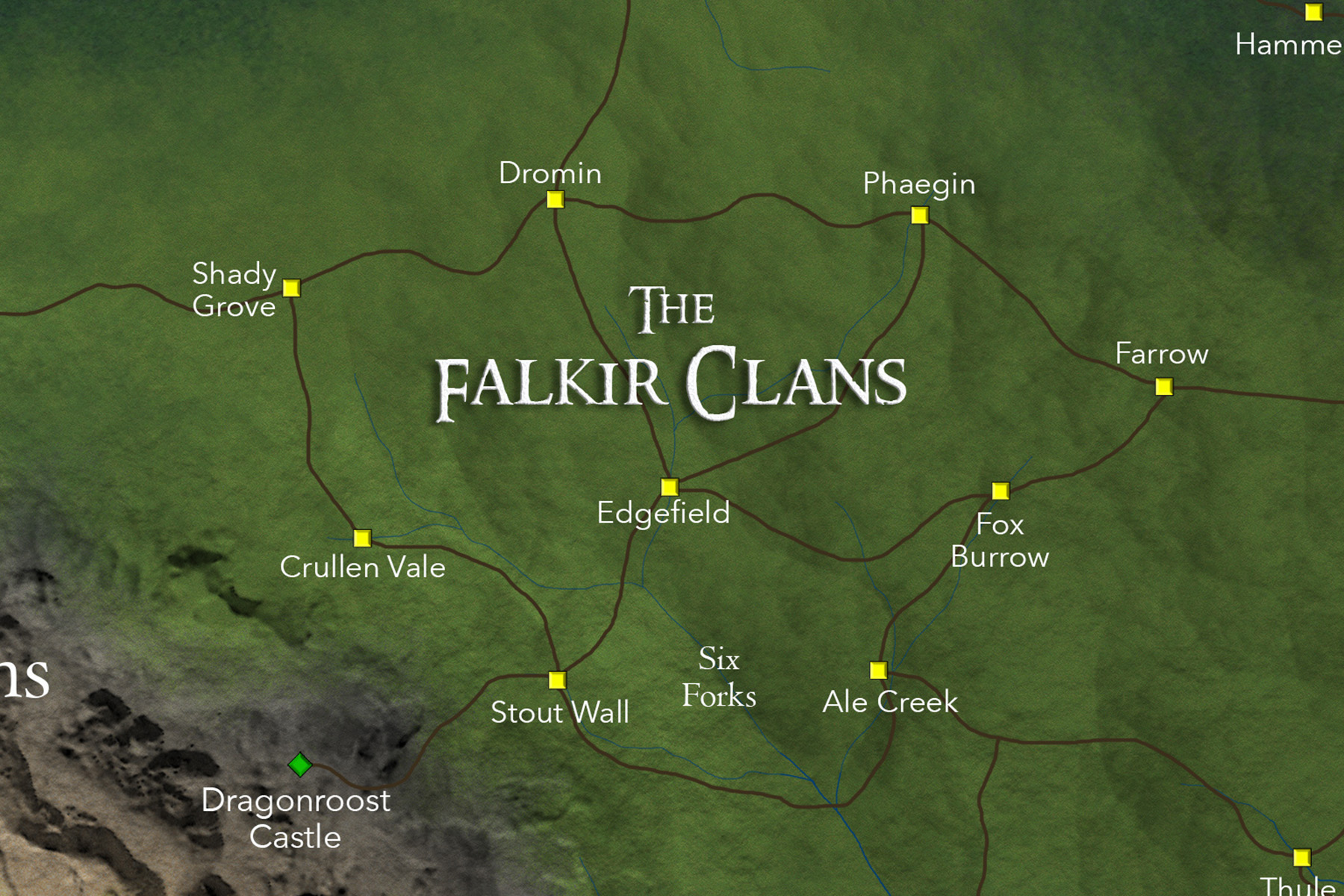 During the Age of Rebirth, a series of clan wars erupted in Khenshire in 1309 CY when eleven clans rebeled against Khenshire. One of the rebeling clans, the Hearther Clan, was wiped out during this civil war. After twenty years of war, ten clans, led by the Gruffwind clan, broke away from the Khenshire area and moved eastward in a great migration. They settled the eastern hills in 1330 CY. Each clan claimed a territory and founded a town. The region was named Falkir, an old grumman word which means "freedom" and eventually came to be known as the Falkir Clans. These ten clans lived in peace for centuries.