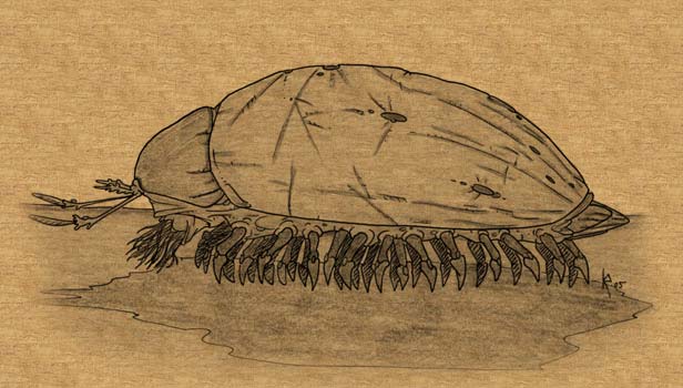 Dredge beetles appear as enormous one ton sand colored beetles with hard chitinous shell plating. They have a 16 pair of small legs with slowly scuttle them through the mud and sand of the ocean bottom. They also have a pair of large appendages at the rear with large paddle like structures which are usually tucked and hidden, but deployed when the creature wants to swim. The complex mouth consists of hundreds of tiny tendrils.