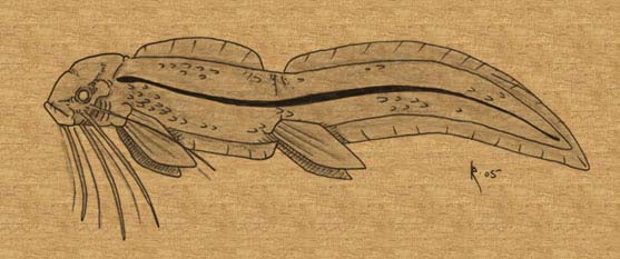 Also known simply as the oil fish or tarfish. The torch fish is a long, narrow silver fish with a black stripe down the length on each side. This 18 inch fish is flexible and almost eel like. Featureless blank eyes - this fish is blind.