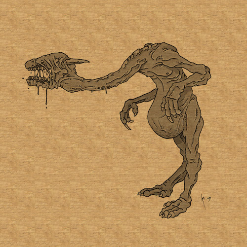 Besides a nasty bite and two sharp claws, the asikoth's most devastating weapon is its breath weapon. During combat, the asikoth can vomit forth a spray of acidic mucus. this thick yellowy substance sticks to armor and skin. This repulsive substance rapidly dissolves wood, metal, flesh, bone and even stone. The process is very painful and will cause spasms in the victim. This vomit can be projected up to 20 feet with a fair degree of accuracy. The asikoth can vomit acid once every few seconds up to 15 times before it has depleted its reservoir. It then takes six hours to replenish its supply.