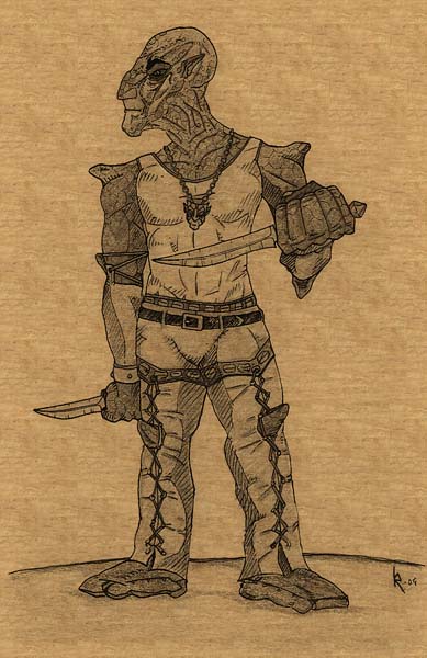 The Sybrenar have slightly bestial faces with sharp, angular faces. They have jutting chins, high cheek bones, large pointed ears and angled eyebrows that give the Sybrenar a rather cruel, almost demonic, visage. Sybrenar have bony protusions at the knees, elbows and shoulders.