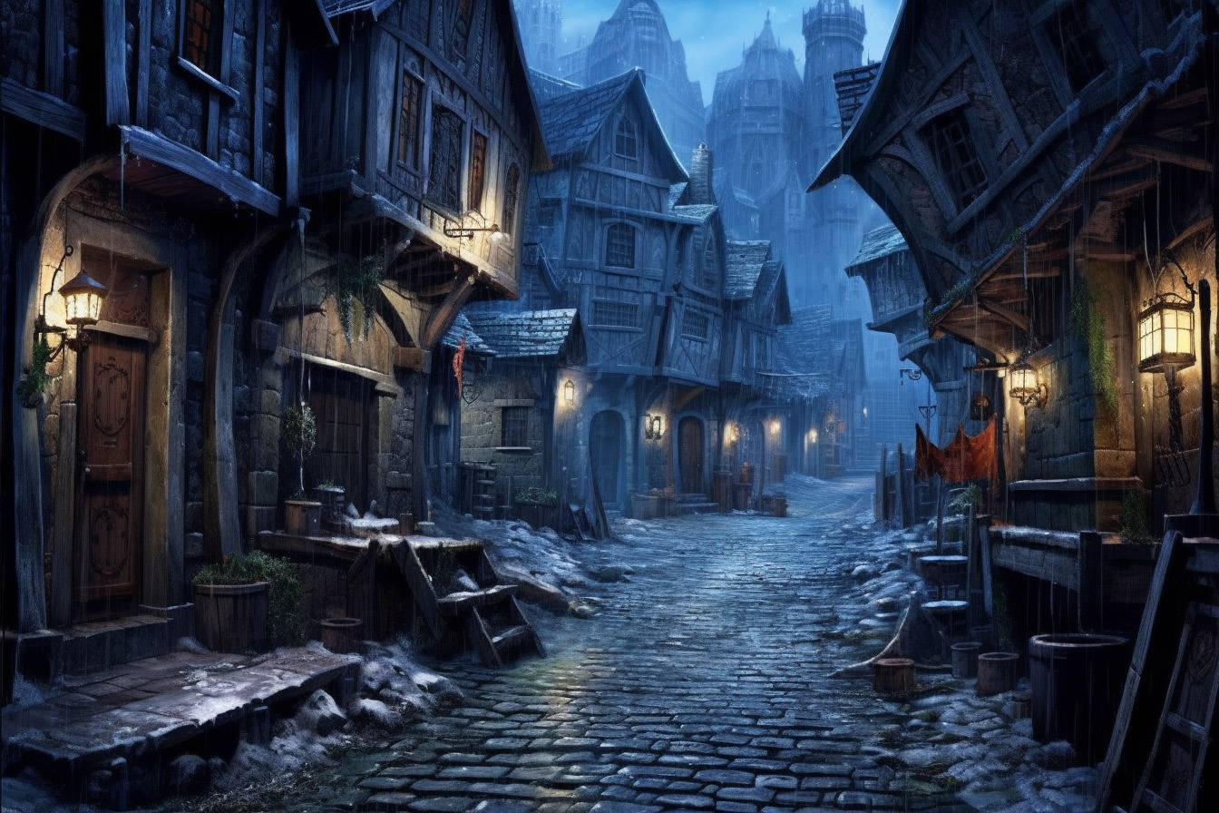 The river ward is a cluster of small huts, ramshackle hovels and shanties that lie clustered between the cliffwall of Grimstone Hill and the banks of the river. This area is home to fishermen, dock workers, porters, farmhands, gamblers, prostitutes, thieves and smugglers. River boats stop by here to drop off or pick up cargo and passengers. The river ward has a few seedy taverns and warehouses. Like Underward, this area is extremely poor. Beggars and homeless here sleep in pigsties or under the stairs, clustered around communal cook pots. When truly bad storms come, most seek shelter indoors or in Underward.