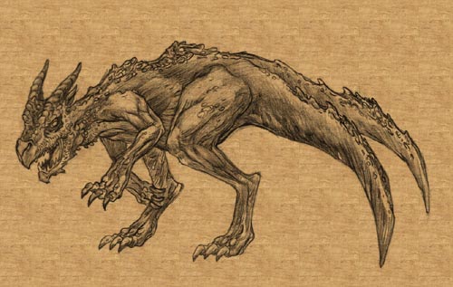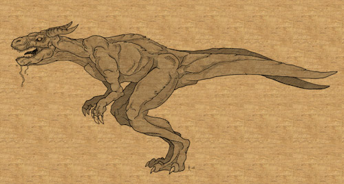 The dreaded torgat is the tall, fast, lean bipedal lizard. The beast stands 4 to 6 meters (14-19 feet) tall and weighs about two to three tons. Its muscled legs allow it to run swiftly. It is covered in large, thick horny scales. Its great reptilian head is crowned by two great swept back horns. It has two tails which it whips back and forth to strike at opponents.