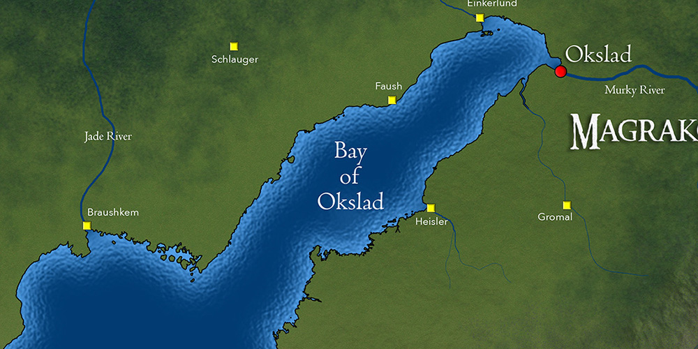 The Bay of Okslad is a long, narrow bay that winds several hundred kilometers into the continent. Okslad, the capital city of Magrakor, sits at the head of the Bay, at the mouth of the Murky River. The Bay of Okslad is fished heavily. Magrakian vessels (and vessels of many other nations) crisscross the waters of the bay. Now that Magrakor and the Sybren Imperium are officially at war, the traffic of the Magrakian navy has increased dramatically. At least two major naval battles between Magrakian and Sybrenar ships have been fought in this bay.