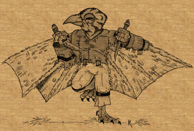 The defining physical characteristics of the avarians is their wing. Each avarian has two large, feathered wings. These wings are partially mounted on the back, but are also extensions of the arm. They consist of a flap of skin between the arm and body, but also extend out beyond the hand with an cartilage spine branching of from the elbow. The basic framework of the wing involves a large flap of skin on each side of the body that extends from the knee to the elbow, much like a bat or flying squirrel. This flap of skin is supported by several spines of cartilage that extend from the elbow and shoulders. A series of muscles along the arms, back and pelvis work in unison to flap the wing. Since the whole body is a sheath of muscle designed around this function, the avarian is a strong flyer.This odd fusion of avian and bat wing structure is not a true wing, nor completely independent of the arms, but somewhere in between. An avarian in flight is able to manipulate objects with his hands and has some limited arm movement.