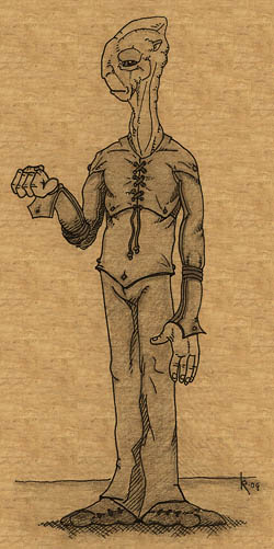 Saridians are tall, thin gangly humanoids with pale green skin, high cheekbones, small mouths and elongated skulls which have the form of a fin-shaped cranial crest. Their have long necks, which when extended to their full height, bring the average saridian to almost 2.5 meters tall (including the cranial crest). Saridians typically live to be 200 years old. They have a high metabolism and voracious appetites.