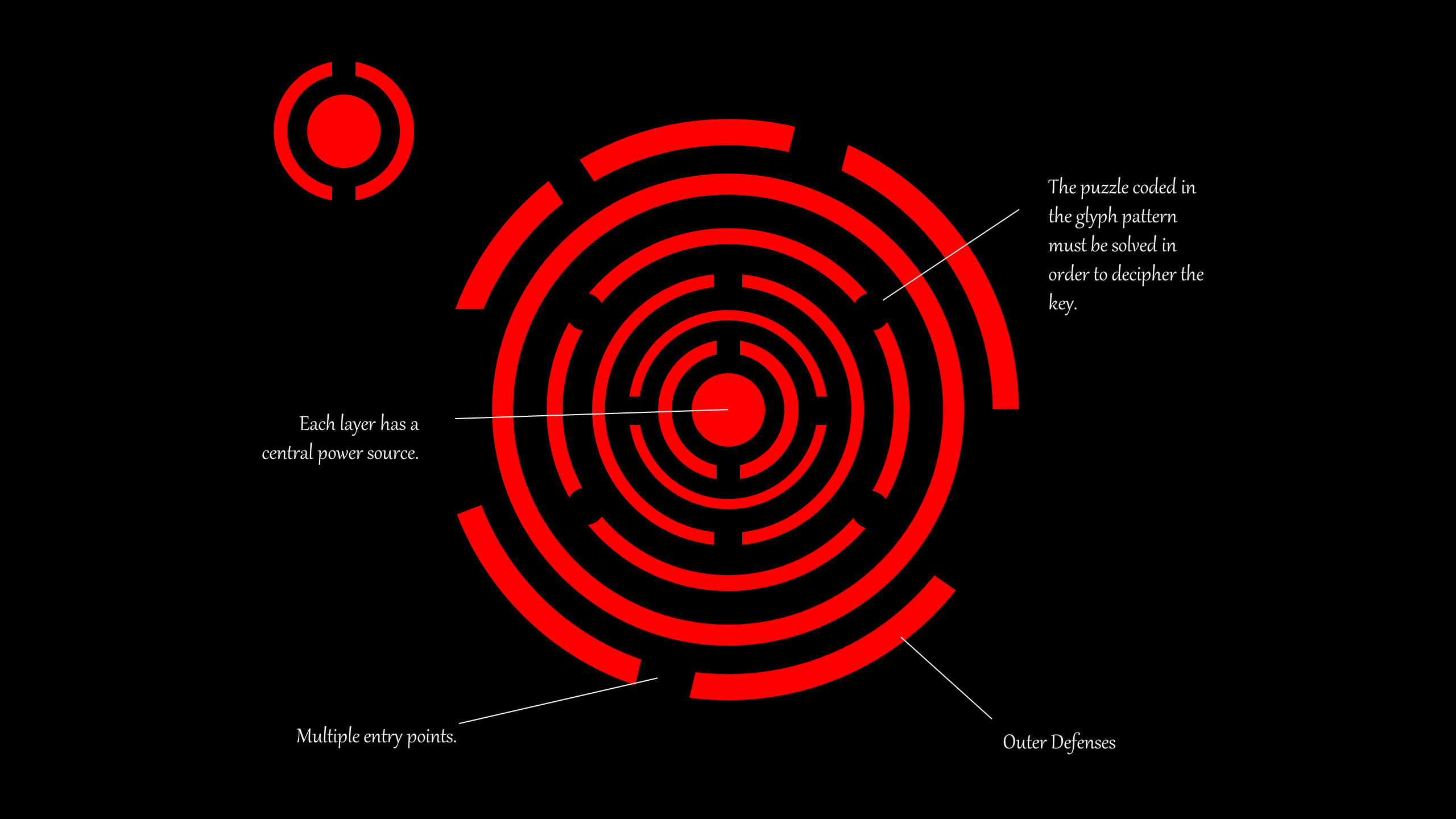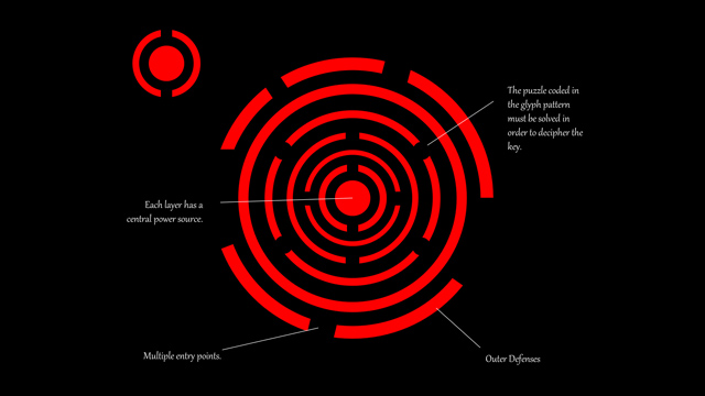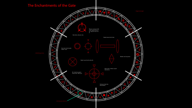 Below is an example of one of the Anchor Glyphs. They are designed to keep the Gate closed and prevent the Gate from being forced open with magic. The Anchor Glyphs are powerful spells in their own right. The actual part of the glyph that is displayed on the edge of the Gate is but the top level in a complex layered labyrinth of geometric puzzles. Each layer more complex than the one above.