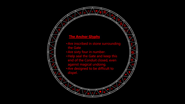 These glyphs are called the Anchor Glyphs. There are a secondary defense that guard against disruptive influences on the seal of the Gate, for instance, a Dispel Magic or a Disjunction. There are sixty four of these Anchor Glyphs.