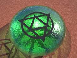 The Avisarr is a flawless gemstone of deep green color shaped like a round, 5 inch diameter lozenge. It is smooth (not faceted) with a slightly rippled surface. The symbol of Ynthar is scored into the gemstone (the lines are actually blackened crystal). Although the gemstone looks to be emerald, it is actually a rare crystalline substance which mages and alchemists call vertrillium. The unique molecular structure of this crystal make it ideal for capturing and storing energy.