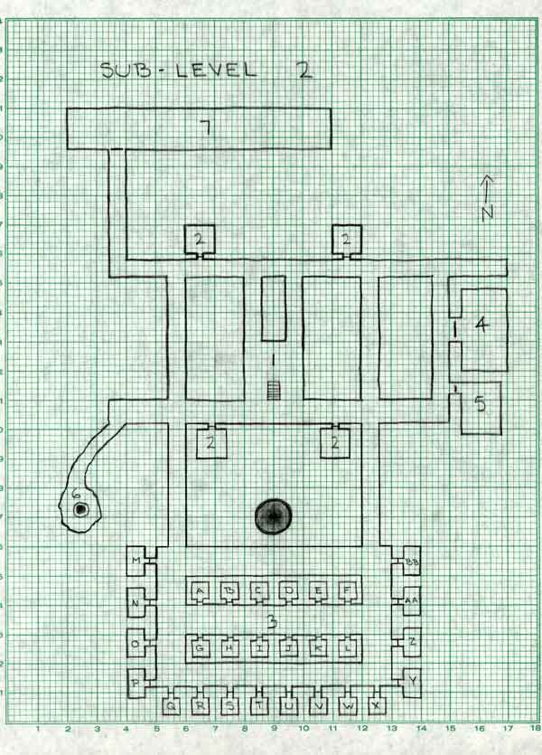 The players will have to use light sources to see in. Inside, you see mounds of garbage and hundreds of rats feasting. Something in the back slithers away from the light. The sliding rod in the wall is a simply bolt lock handle. There is a handle on each end. If the players open the door and step inside, the floor is actually filled with squishy liquid about two feet deep. A large square shaft is visible in the ceiling with cracks (from doorways) letting light in. The shaft goes up at least fifty feet (three, possibly four levels).