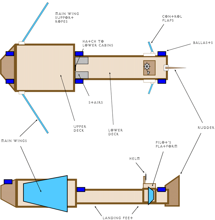 The Kalimuran expedition has completed their first two objectives. They have studied the mass-thrust properties of the mineral thoroughly and constructed a large wooden "ship" that uses the mineral to fly. This vessel does not look like a seagoing ship. Rather, it resembles a giant bird. The hull is fashioned from lumber harvested from native trees. Two great wings (actually large retractable sails that extend out from the sides) catch the wind and provide propulsion. These wings can be extended and retracted using a complicated rigging system of ropes and pulleys. Two smaller wings at the rear of the craft serve as a rudder.