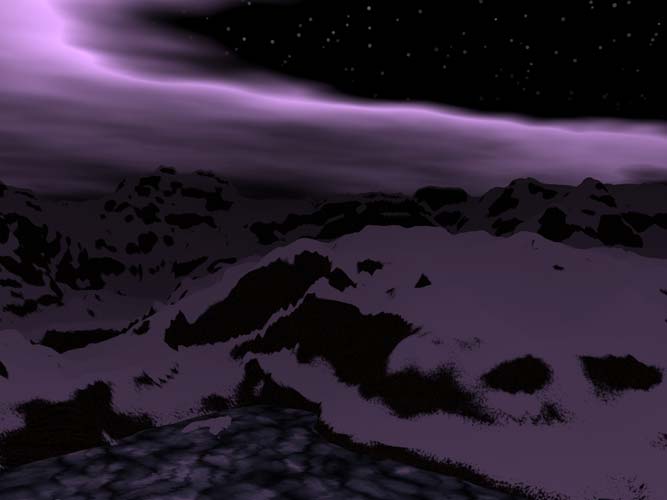The stark snowy landscape of northern Borrell under the night time northern lights.
