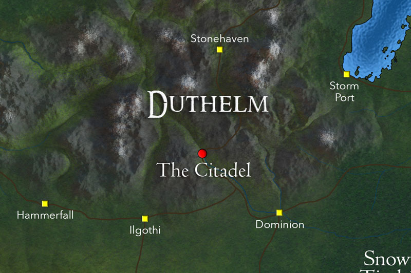 Hammerfall | 26,400 | A city of miners and smiths that lies northwest of the Citadel in the western foothills of the Malus Mountains. Hammerfall produces most of the weapons and armor for Duthelm and conducts patrols along the western foothills. Occasionally, Hammerfall will also be the launch point for a minor raid against the towns and villages of Carrikos. |