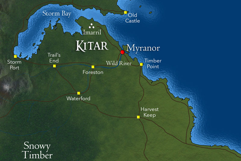 Kitar is a heavily wooded region with only dirt roads cutting through the forests. Although goods are rafted downstream from Foreston to Myranor, the Wild River is not navigable upstream from Foreston by any water craft due to many rapids, twists, turns and falls.