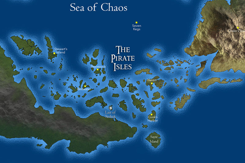 The Pirate Isles is a large archipelago stretching across the Sea of Chaos from the Coalition to Myria. It is a string of emerald isles ranging from huge mountain straddled land masses to barnacle crusted rocks no bigger than a house. Many of these islands are volcanic, with several active volcanoes among them. Several attempts have been made to map and count all the islands, but no one has ever succeeded. It is estimate that there are over 1,000 islands in this region. Most of the larger islands have been named... many have more than one name. The entire region is very tropical with hot summers and no winter to speak of. Most of the islands are lush and thick with jungle vegetation. Tropical flowers, palm trees, coconuts and fruit are plentiful as well as wild boars, monkeys, snakes and parrots which inhabit many of the islands.