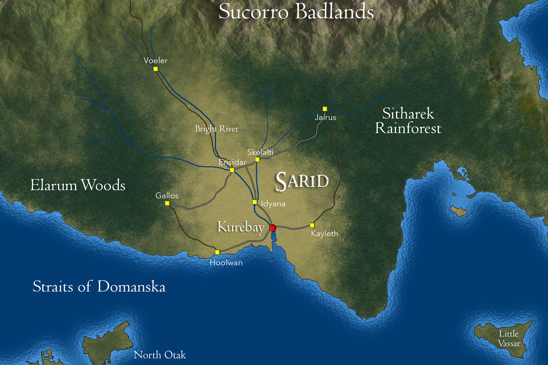 The interior of Sarid consists of rolling grasslands, well-tended groves, fruit orchards, vineyards and a patchwork of fields. Sarid has a good system of paved roads connecting all major towns and the capital city of Kurebay.
