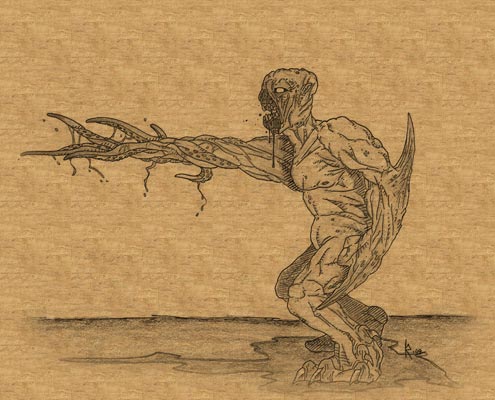 Etherbanes are not a true race to themselves. Rather, these creatures are born as normal children and can be born to any race. However, because of their mutation, they will begin to mutate as their reach puberty. Physical mutations will be subtle at first, but will grow more severe with each passing month. In addition, because of their unique feeding method, small animals and plants around them will often die. A young person with this affliction will lose their appetitie and refuse food. They will also begin to exhibit aggressive, almost animalistic, behavior. The mutations, odd behavior and incidents of death around them will often lead to accusations of witchcraft and such. These unfortunate young men and women are often killed or driven from their villages by superstitious and fearful peasants. Those driven from civilization will wander alone in the wilderness as their mutations get more severe and their strength grows.
