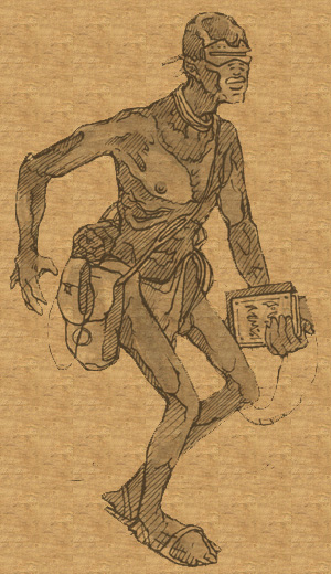 The baenites are somewhat xenophobic. They generally avoid contact with outside cultures and do not welcome travelers. Culturally purity has been the main reason and it has been maintained for centuries. However, as the decades pass, more and more baenites leave the Baen desert to seek what lies beyond the dunes. Baenites are rare in the outer world, but most races are aware of the baenites just as the baenites are aware of most outside cultures. The most frequent baenite renegades are mages and scholars who only seek knowledge and believe that the only way to understand life and the world is to experience it firsthand. Rarely are these renegades welcomed home. Therefore, the decision to leave is a grave one. Between 20 and 50 baenites leave each year. Because of their xenophobic tendencies and their brutish facial features, the baenites are known to the world as desert demons, dune devils, dark ones and similar fear filled names.
