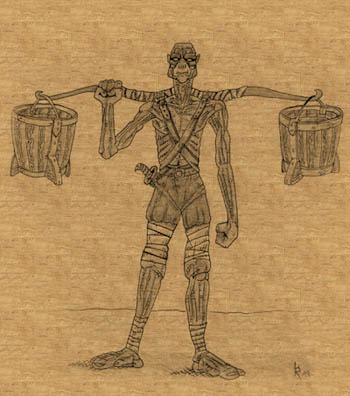 Primary food sources are adapted desert crops (aided through irrigation), various desert animals and the occasional lightning lizard. Very rarely a dragon makes an appearance, but then it is the dragon that eats and the baenites that are eaten. The sandworm is considered a delicacy among the baenites. However, these rare, three meter long horrors are hard to find and even harder to kill. Food surplus and food storage does not occur as there is usually not quite enough to feed everyone. (It is considered an insult to the host to waste even a single crumb). Indeed, wasting food at any time is virtually unheard of. Food creation magic is needed to help most villages get by. Serving in this capacity, the baenite priests are much respected.