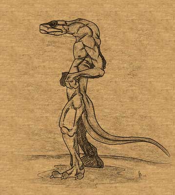 The Guldra are a mysterious and enigmatic race. These rarely seen creatures wander the desert in small groups and dwell in stone houses deep in the desert. The guldra are tall and slender, brown skinned reptilian humanoids that vaguely resemble walking snakes. They are covered in glossy, brown scales much like a snake’s skin. They have flexible spines that flow into long snake-like tails. Their long limbs appear delicate, but are actually quite strong. Their heads are hooded much like the cobra. Guldra walk on three toed feet and manipulate tools and weapons with three fingered hands. The average guldra warrior stands 2.5 meters tall (8 feet), but only weighs about 175 pounds. Often they wear no clothing, only weapon harnesses and tool belts. They are found in the deepest regions of the Ahtabi Desert. Very little is known of their culture. They speak a strange language of hisses and clicks.